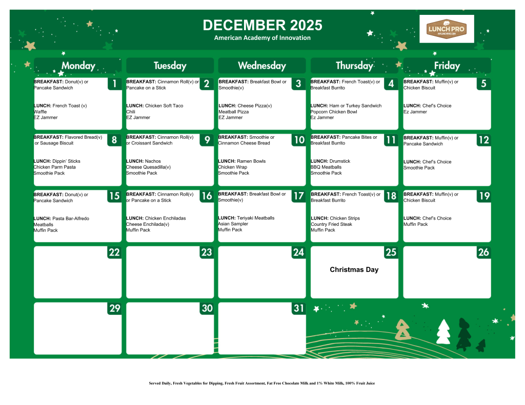 Eligibility for free or reduced school meals does not cover any student account balance accumulated before eligibility. These deficit account balances must be paid. This benefit applies to both lunch and breakfast at the American Academy of Innovation. A complete meal consists of three components, one of which must be a fruit or a vegetable. Milk and juice are included with a meal. An extra milk or juice in addition to what is included with the complete meal will be charged at the regular rate of $0.50 each. If a child takes a second lunch, it will be charged at the regular price of $4 per meal.